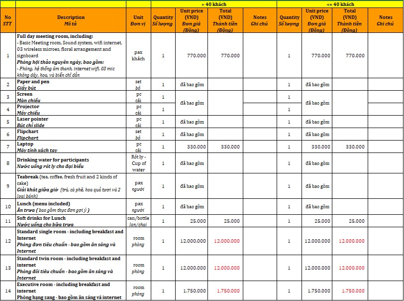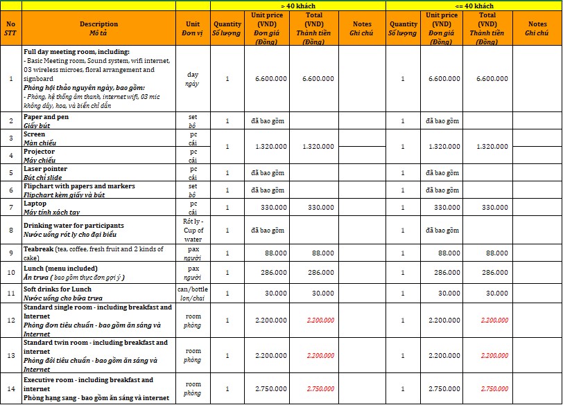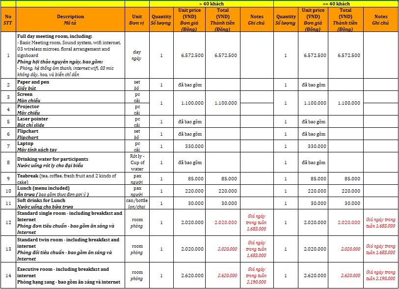BÁO GIÁ TỔ CHỨC HỘI THẢO KHU VỰC QUANH HÀ NỘI NĂM 2020